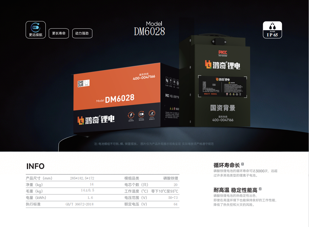 鸿奇锂电DM6028是一款采用磷酸铁锂电芯的电池模组,额定电压64V,电量1.6kWh。模组净重约14kg,尺寸为285*182.5*172mm,方便安装与运输。工作温度范围为-10°C至55°C,适应常见工作环境。DM6028具备IP65防护等级,具有一定的防尘防水能力。产品符合GB/T36672-2018标准,循环寿命可达3000次,热稳定性高。