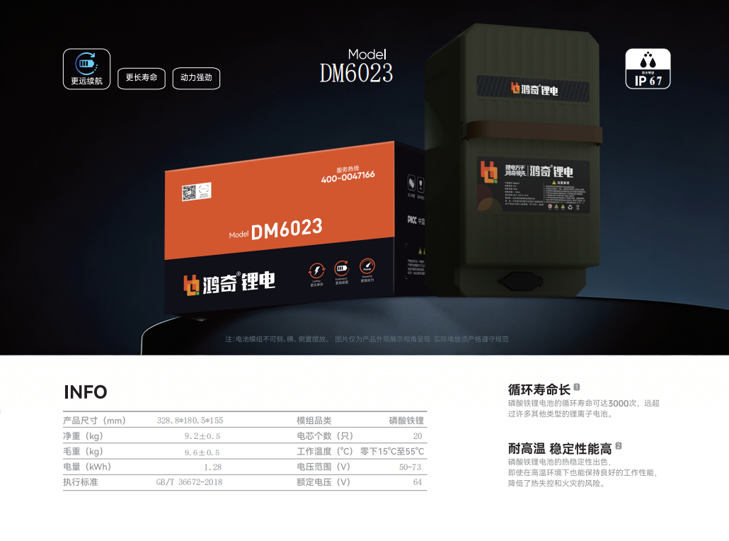 鸿奇锂电DM6023是一款采用磷酸铁锂电芯的电池模组,额定电压64V,电量1.28kWh,模组净重约9.2kg,尺寸为328.8*180.5*155mm,具有良好的便携性。其工作温度范围为零下15°C至55°C,可适应多种环境条件。DM6023具有IP67防护等级,防尘防水,安全可靠。产品执行GB/T36672-2018标准,循环寿命可达3000次,并提供三年质保服务。