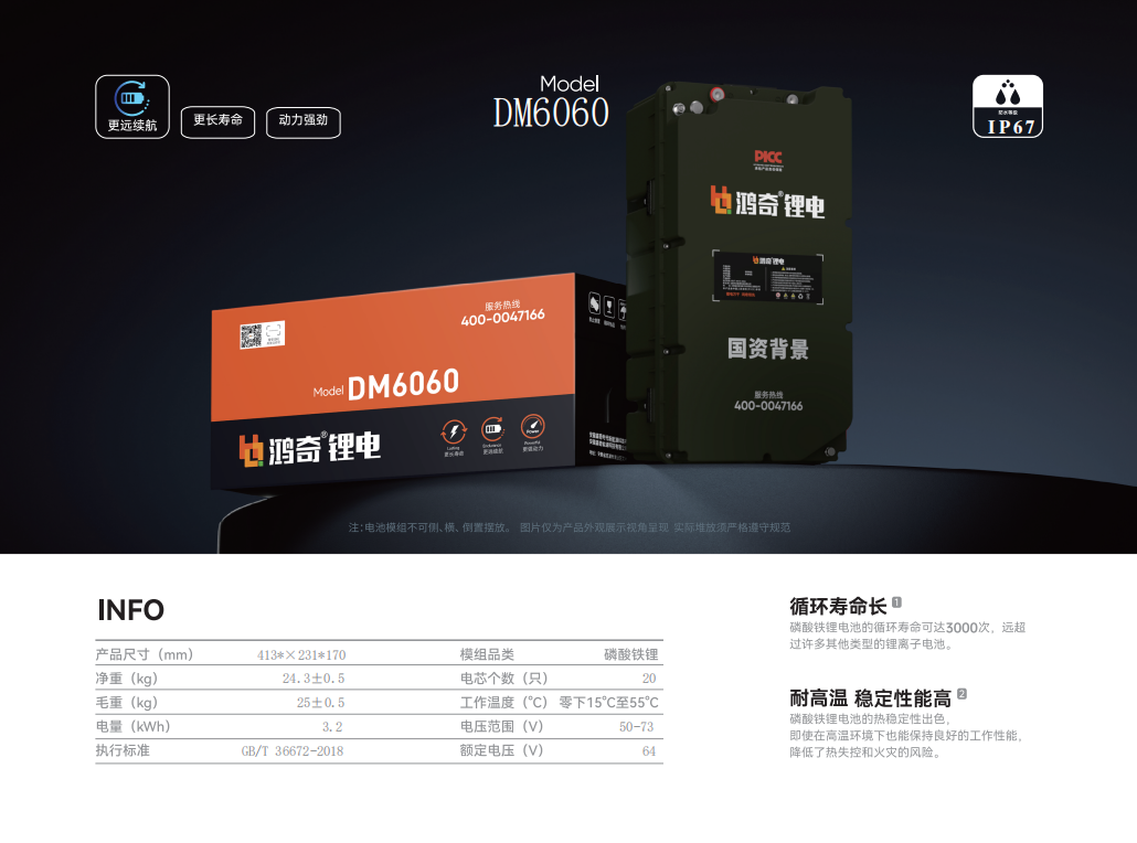 鸿奇锂电DM6060是一款采用磷酸铁锂电芯的电池模组,额定电压64V,电量3.2kWh,适用于需较长时间运行的设备。模组净重约24.3kg,尺寸为413*231*170mm。工作温度范围为零下15°C至55°C,可适应多种环境条件。DM6060具有IP67防护等级,密封性能良好。产品符合GB/T36672-2018标准,循环寿命可达3000次。