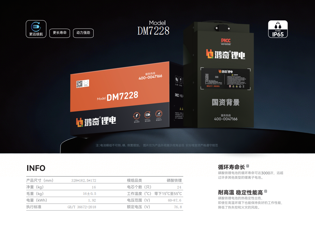 鸿奇锂电DM7228是一款采用磷酸铁锂电芯的电池模组,额定电压76.8V,电量1.92kWh。模组净重约16kg,尺寸为328*182.5*172mm。工作温度范围为零下15°C至55°C。DM7228具备IP65防护等级,可适应多种环境条件。产品符合GB/T36672-2018标准,循环寿命可达3000次,稳定性能高。