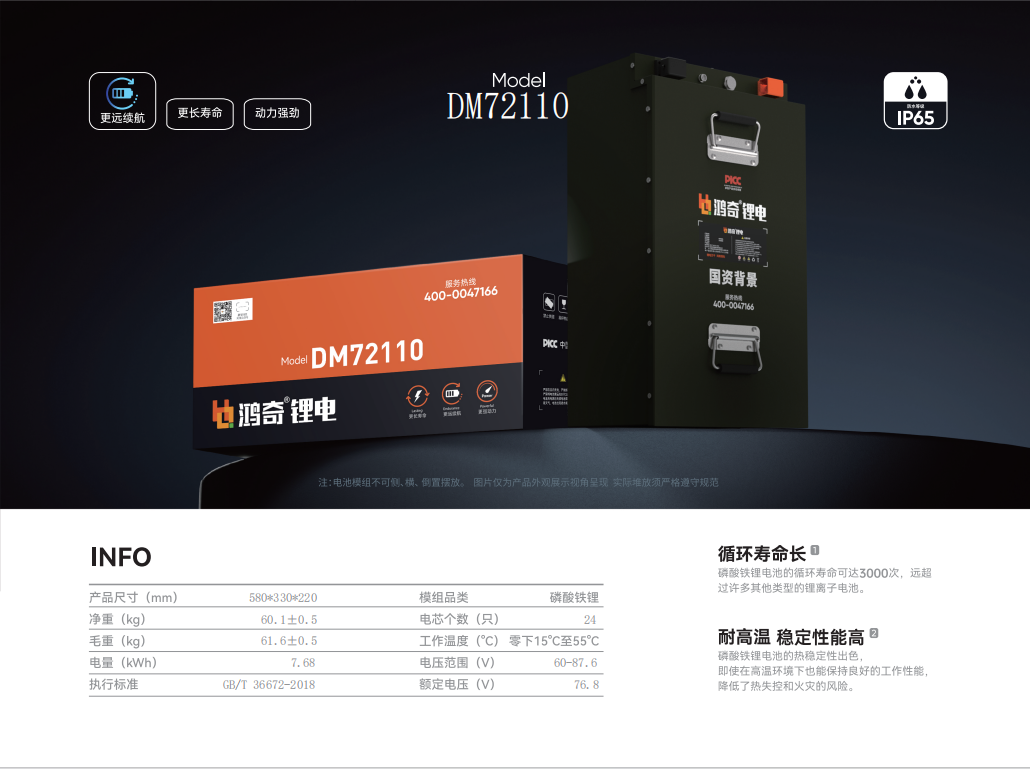 鸿奇锂电DM72110是一款高压大容量磷酸铁锂电池模组,额定电压76.8V,电量7.68kWh,适用于高压大功率场景。模组净重约60.1kg,尺寸为580*330*220mm。工作温度范围为零下15°C至55°C。DM72110具备IP65防护等级。产品符合GB/T36672-2018标准,循环寿命可达3000次,稳定性能高。