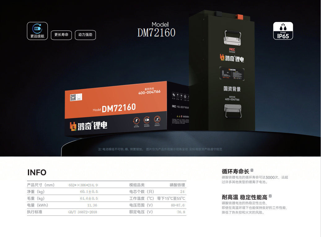 鸿奇锂电DM72160是一款旗舰级磷酸铁锂电池模组,额定电压76.8V,电量11.36kWh,适合超长续航与重载需求。模组净重约60.1kg,尺寸为652*306*214.9mm。工作温度范围为零下15°C至55°C。DM72160具有IP65防护等级。产品执行GB/T36672-2018标准,循环寿命可达3000次,耐高温,稳定性能高,安全可靠。使用前请仔细阅读说明,确保模组正放,避免安全风险。